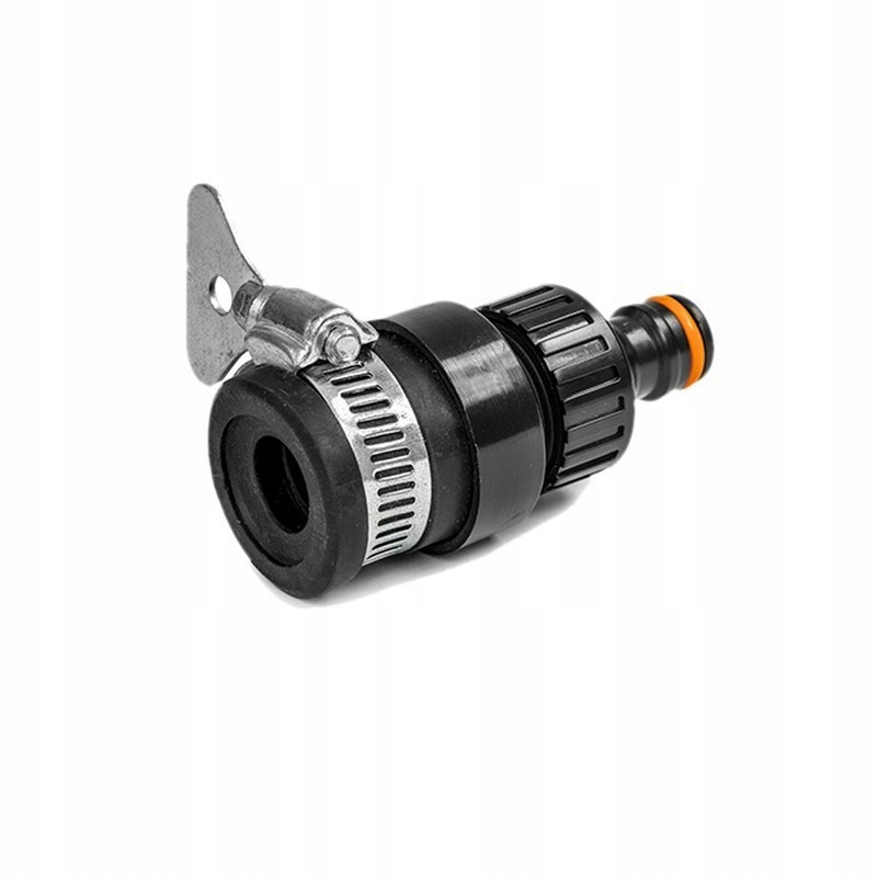 Plastikowa przejściówka (adapter) na kran o średnicach od 22 do 24mm oraz przyłączu typu męski klik na wąż ogrodowy wraz z opaską zaciskową.